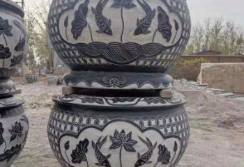 古老石槽,精致圓形養魚水缸,由青石雕刻而成,是一款充滿古樸氣息的水缸。水缸的外觀由精致的青石雕刻而成,形狀是圓形,墻壁高而厚,中央有一個古老的石槽,邊緣處是一道微微波動的水流,整體外觀高雅典雅,充滿古樸氣息。