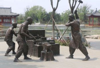 采用銅雕這一經典材質,利用銅的質感與耐久性,塑造出富有歷史厚重感的景觀雕塑。銅雕的古樸色澤,能自然融入戶外環境,經歲月沉淀更具韻味,成為公園等場所中持久的文化符號,以雕塑小品的形式,為景觀增添人文深度。精準復刻傳統市井商貿場景,從人物服飾(長袍、傳統發髻 )到交易道具(布匹、長桌 ),細致展現舊時風貌。商人的長辮、婦人的寬袖衣衫,還原特定歷史時期的著裝特征,讓觀者直觀感受往昔生活片段,喚醒對傳統商貿文化的記憶,成為民俗文化傳播的生動載體。作為景觀雕塑,與周邊自然環境(草地、樹木 )呼應。人物、道具的布局,既形成獨立觀賞焦點,又與綠意背景和諧共存,成為公園景觀中文化與自然融合的節點,供游客駐足、觀賞、聯想,提升公共空間的文化體驗與藝術氛圍,使雕塑小品成為激活景觀活力、講述文化故事的媒介。